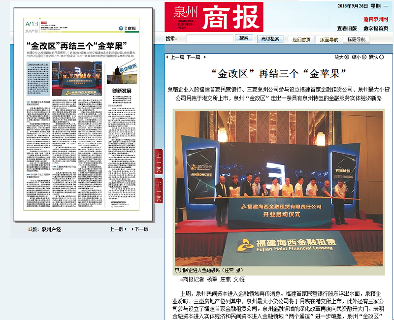 泉籍企業(yè)入股福建首家民營(yíng)銀行、三家泉州公司參與設(shè)立福建首家金融租賃公司、泉州最大小貸公司月底于港交所上市,泉州“金改區(qū)”走出一條具有泉州特色的金融服務(wù)實(shí)體經(jīng)濟(jì)新路。