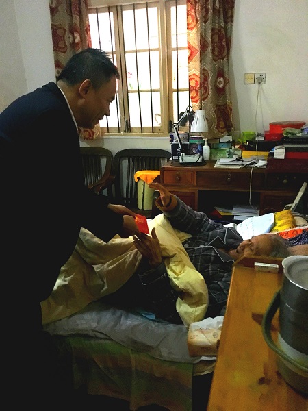 “您老身體恢復(fù)得怎么樣?”在原東湖村退休村主任蘇齊杰家中,朱丹監(jiān)事長(zhǎng)與其親切交談。蘇美清書(shū)記介紹,老主任今年72歲,于2017年初發(fā)現(xiàn)患晚期肺癌,現(xiàn)經(jīng)常進(jìn)入醫(yī)院治療,花費(fèi)較大,屬因病致貧的困難戶。朱丹監(jiān)事長(zhǎng)祝他早日恢復(fù)健康,并代表公司給其全家拜個(gè)早年。