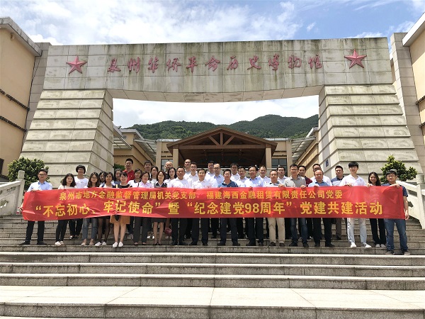 7月5日上午,海西金租黨委與黨建共建單位泉州市地方金融監(jiān)督管理局機關(guān)黨支部共同開展“不忘初心、牢記使命”暨“紀(jì)念建黨98周年”主題黨日活動,泉州市地方金融監(jiān)督管理局黨組書記、局長陳德慶,海西金租黨委書記、總裁潘青松,以及兩個單位黨員代表共計40余人一同前往南安市金淘鎮(zhèn)參觀泉州華僑革命歷史博物館和葉飛將軍故居。